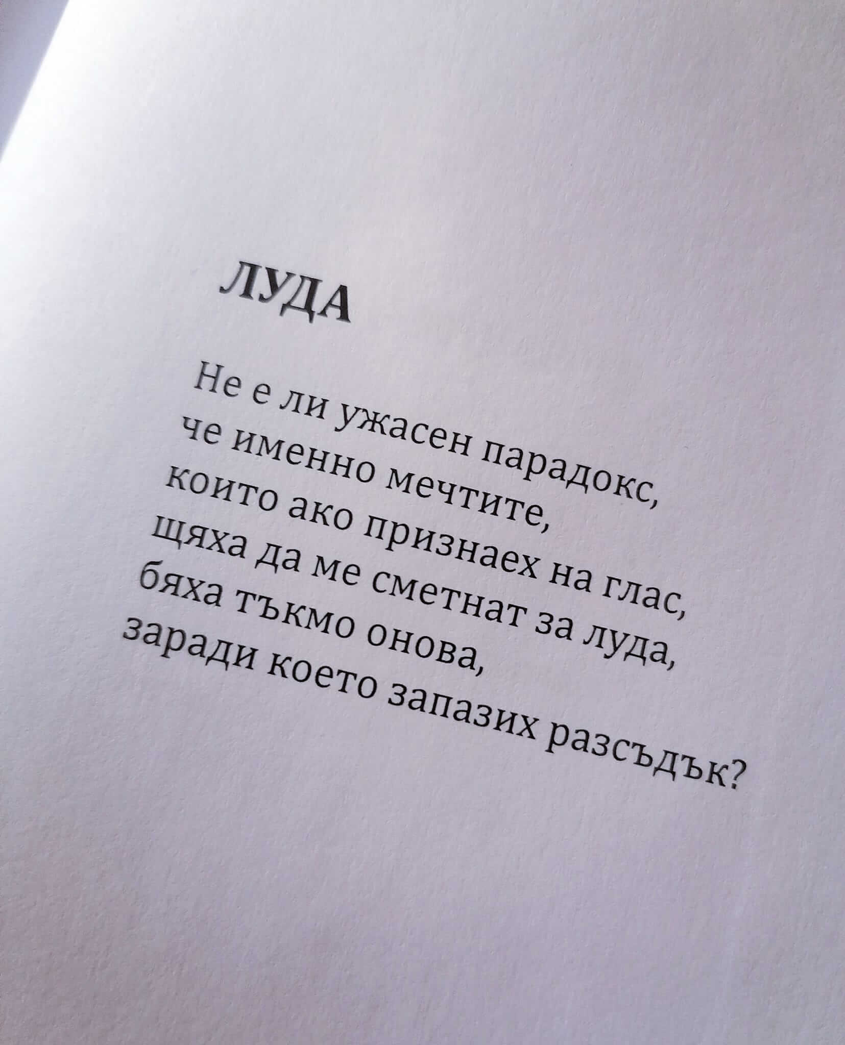 Понякога вдигаш поглед и виждаш как четирите стени около теб започват да се стесняват, притискайки те безпощадно, отнемайки всяка твоя глътка въздух. Дробовете ти отказват, получаваш гърч от остър спазъм и падаш сломен на земята. Светът се върти, а опитите ти да се изправиш един след друг се провалят. Сгромолясан притискаш длани към очите си, за да ги скриеш и никой да не вижда в тях безпомощното. Сезоните се сменят бързо, а хората около теб – още повече. Усмихваш им се, по-лесно е да ги накараш да си мислят, че си глупав и повърхностен, отколкото да им разкажеш за вечната битка в живота ти. За това как денят ти започва с избор и завършва с такъв. За това как всяко ново утро е плод на решение от вечерта и следващото никога не е гарантирано.